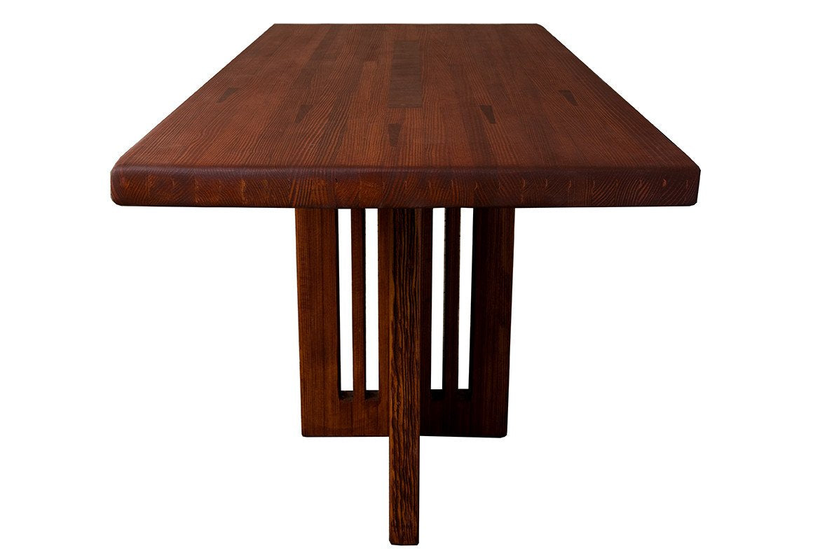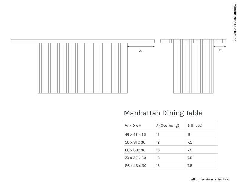 The Manhattan Dining Table answers the call for a "high design" small dining table with maximum legroom. Our unique, spliced-through, "plus-sign" base creates an ample strip of exposed end grain on top and plenty of room to move underneath. The Manhattan Dining Table is perfect for any eco-conscious homeowner who wants to make a big statement with a small footprint. Made from vintage, reclaimed bowling lane heart pine, this solid-wood construction will last for generations of urban dwellers.