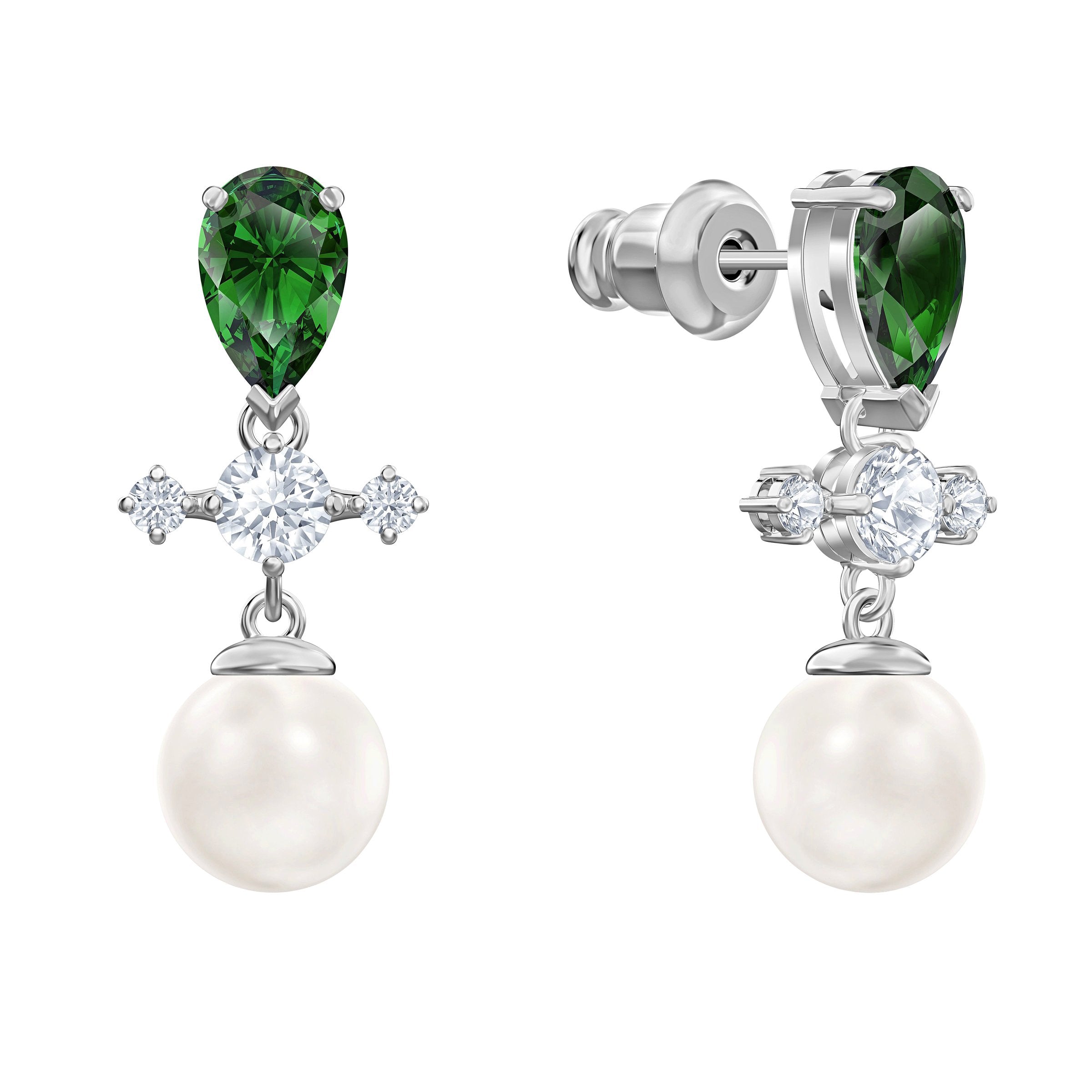 Our rhodium plated Perfection collection is inspired by the latest trends in contemporary jewelry design. This exquisite pair of drop pierced earrings brings together a mix of materials, including green-colored stones and classic Crystal Pearls. Radiant and timeless, they will lift any daytime or evening outfit.Article no.:5489440