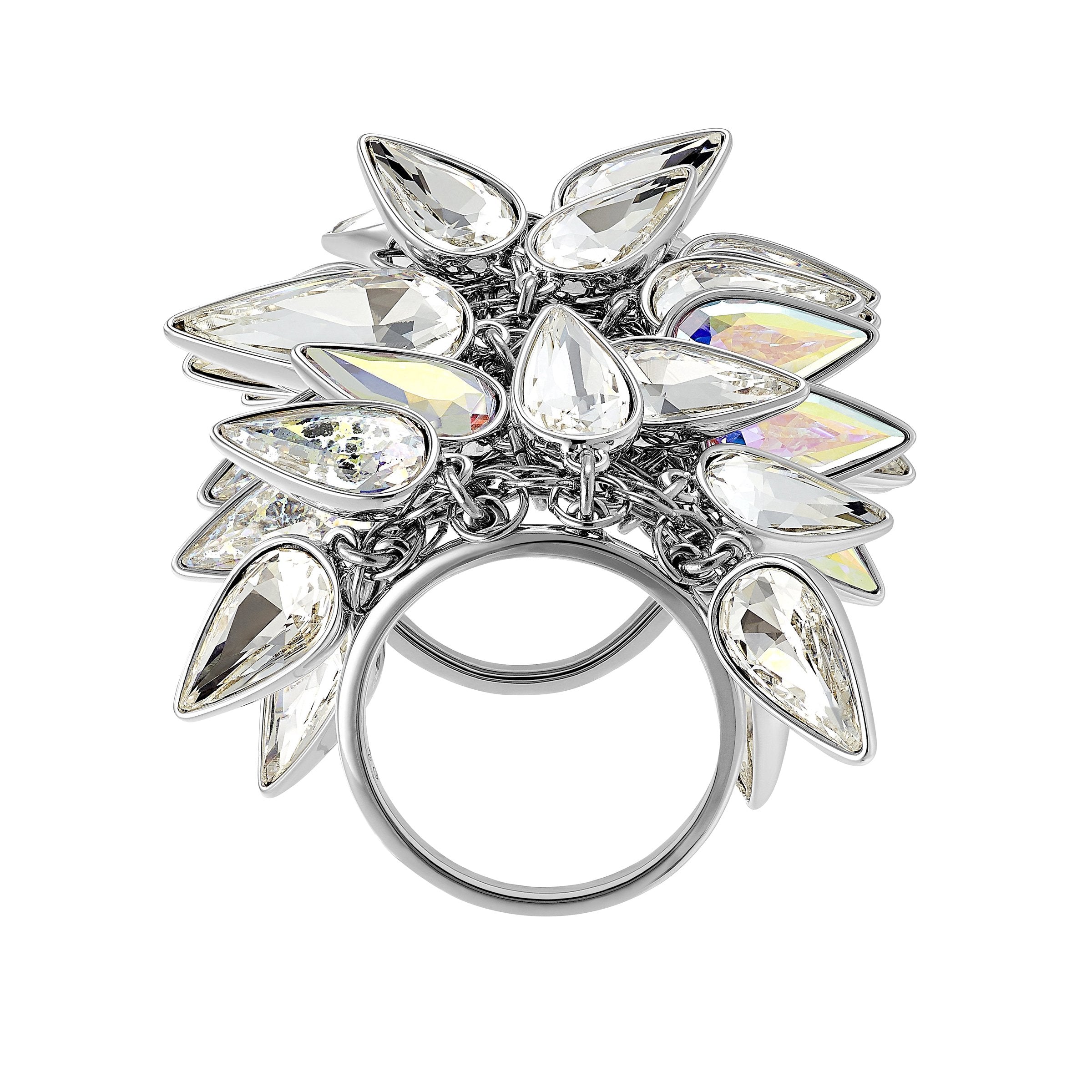Swarovski’s desire to take jewelry design to the next level shines through this statement ring. The elaborate silhouette is crafted in delicate rhodium plated metal work, which has been densely strung with a sumptuous number of dangling crystals in a mix of icy hues. Part of our Polar Bestiary collection, it pays tribute to the wildlife of the Arctic Circle, with the crystal silhouettes echoing the frosted fur and sharp claws of a polar bear. An elegant and abstract interpretation of the Nordic natural world, it will pair well with other pieces from the jewelry line for special occasion styling.Article no.:5490239