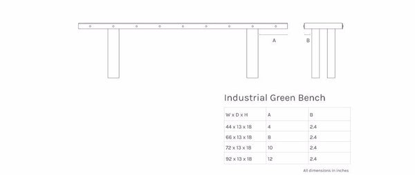 CounterEv's Industrial Green Bench features our signature steel I-beam legs. Custom options include steel banding, stain, size, and inlays.