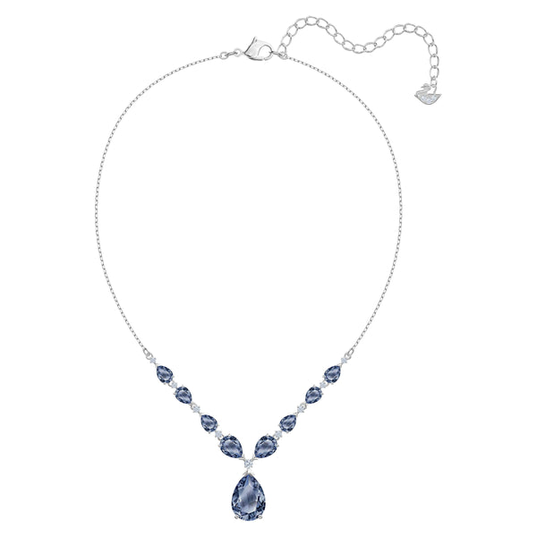 Dial up the glamour, whatever the special occasion, with this stunning necklace. Perfect for the festive season, the rhodium plated design features dazzling blue crystals. The pear-shaped prong-set centerpiece dangles alluringly on this shorter design, making it ideal for illuminating...