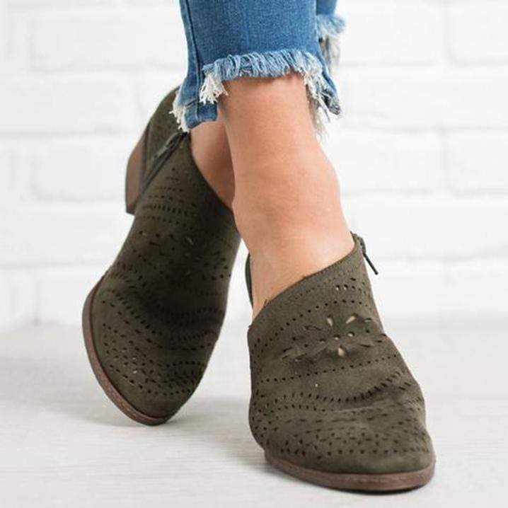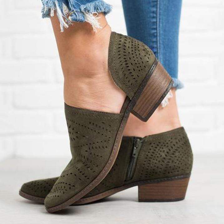 Hollow-Out Low Heel Cutout Booties Faux Suede Zipper Ankle Boots