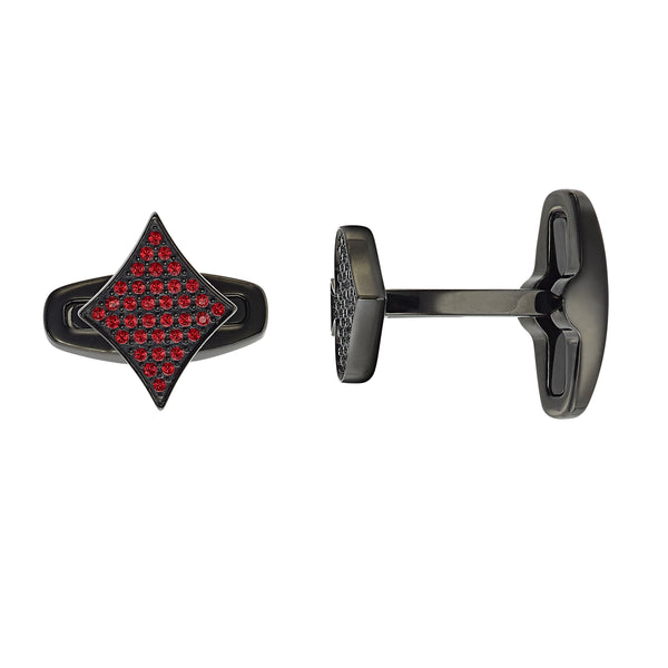 Spela ett vinnande stildrag den här säsongen med detta trendiga par asymmetriska manschettknappar i svart PVD, som passar in i vår Tarot Magic-familj. Inspirerade av spelkort visar de upp en röd kristallutsmyckad diamantsymbol och ett glittrande svart klubbmotiv. En ess...
