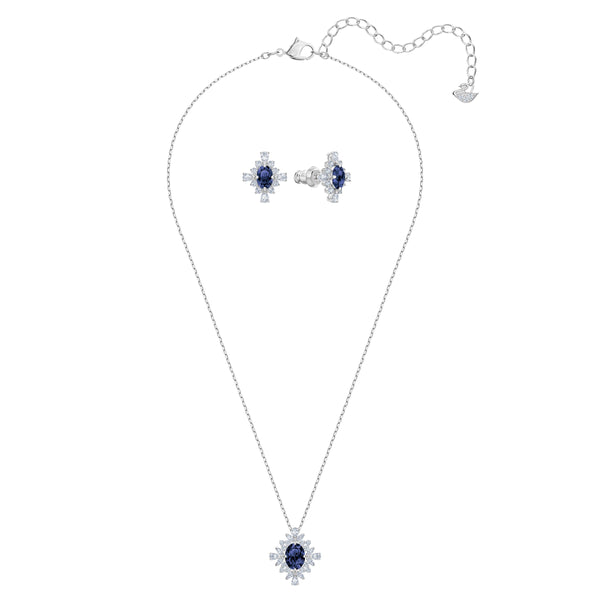 Välj lyxig stil med detta raffinerade rodiumpläterade set, som innehåller ett halsband och ett par genomborrade örhängen. Halsbandet sprudlar av färg och vintageglamour och visar upp en kunglig blå kristall i mittpunkten, vackert framhävd av abstrakta blomformer i överdådiga gnistrande...