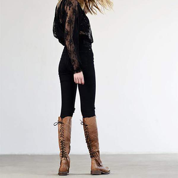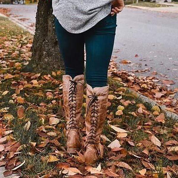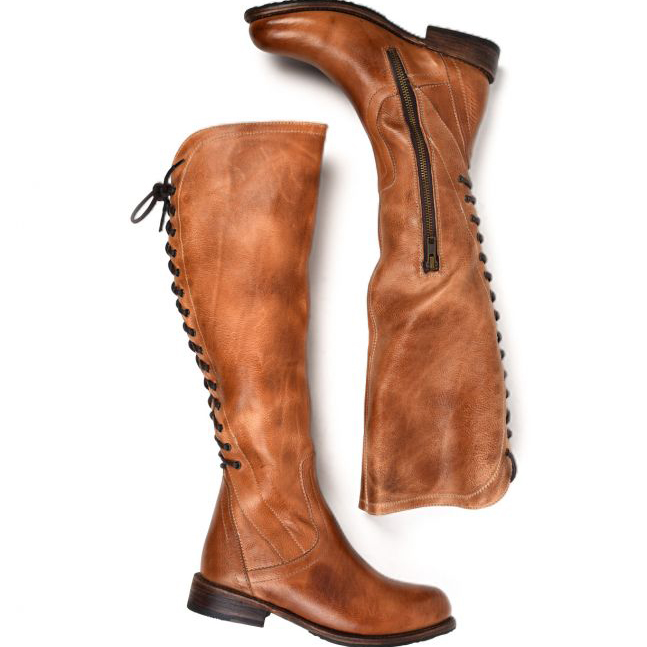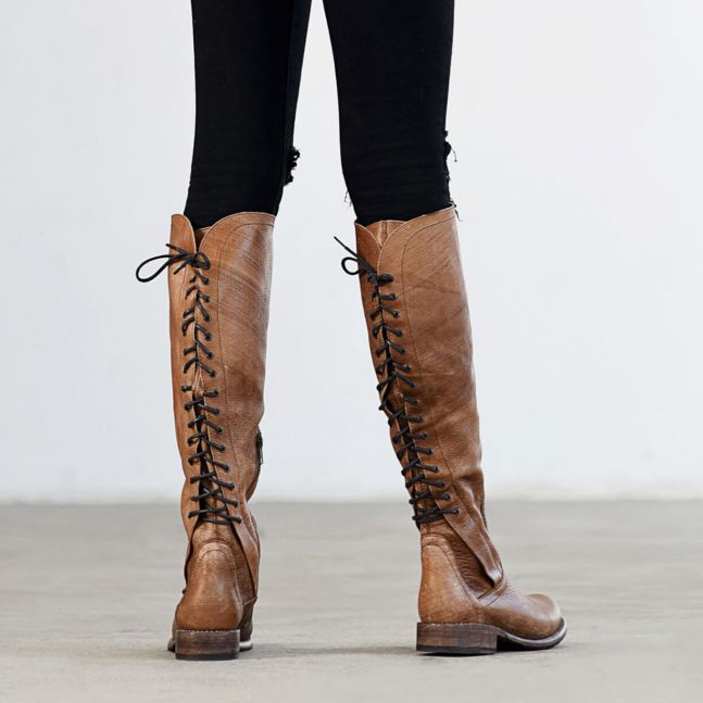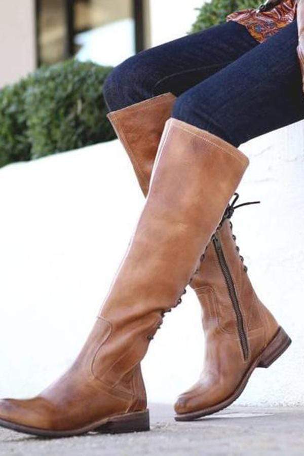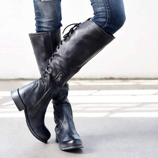 Mode och bekväma långa stövlar med låg klack för kvinnor